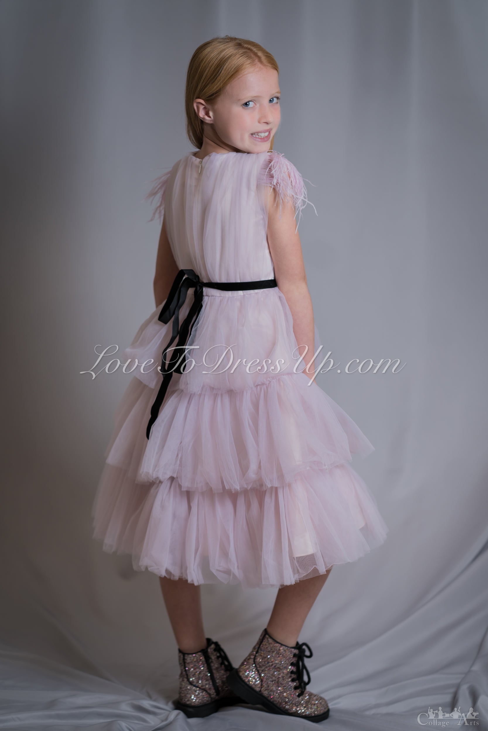 This Lavender Ruffle Dress with Feather Sleeves is a dreamy, elegant choice for your little one. The soft lavender color and layered tulle ruffles create a whimsical, voluminous silhouette, while the delicate feathered sleeves add a touch of unique charm. Crafted with a cotton lining for all-day comfort and designed with no perking for a smooth, natural fit, this dress is perfect for special occasions and celebrations.