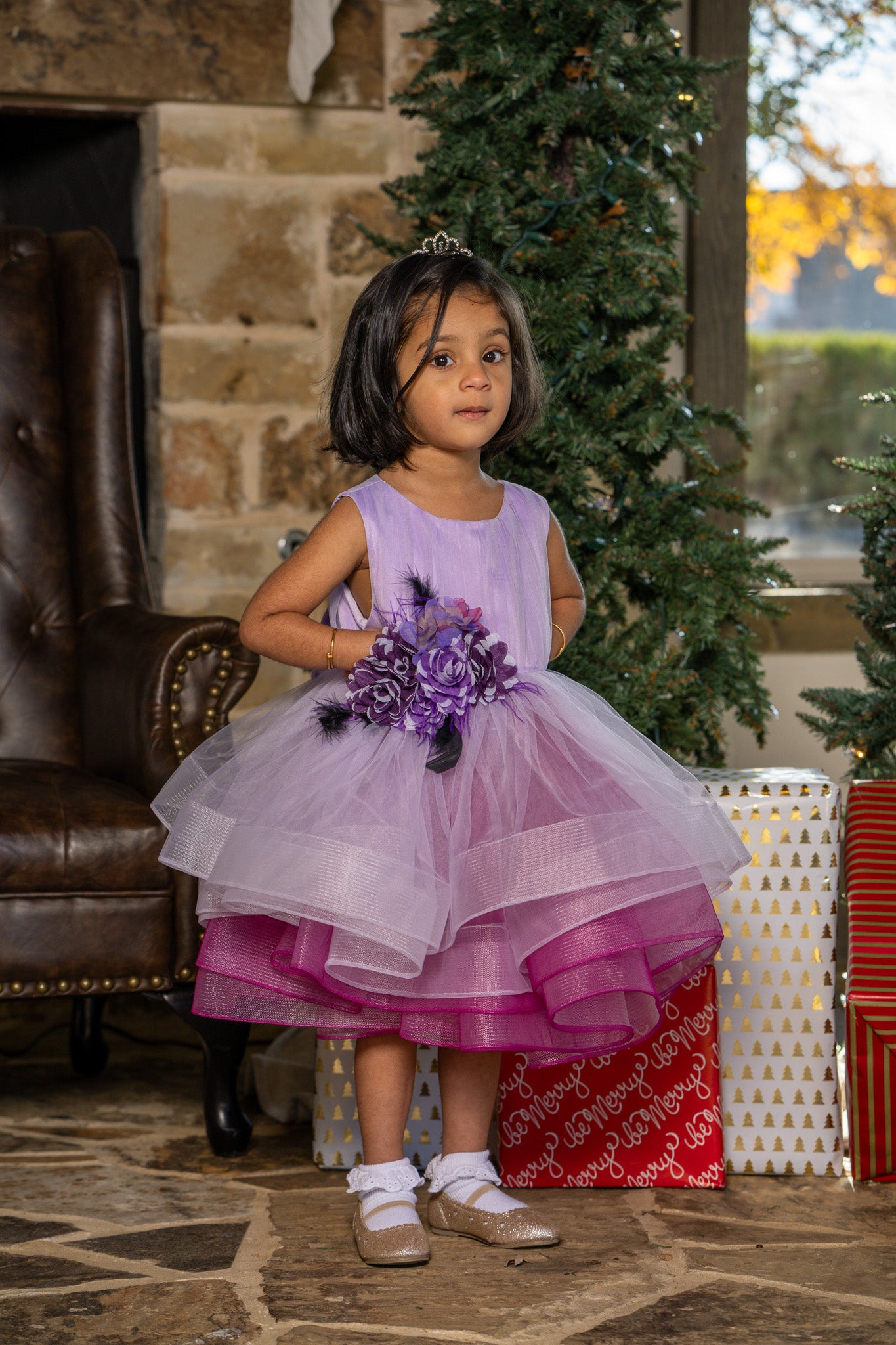 Delight in the charm of the Lilac Bloom Party Dress! This enchanting dress features a soft pleated lilac bodice paired with a voluminous layered tulle skirt in shades of lilac and magenta for a striking contrast. A stunning floral applique with feather accents adds a whimsical touch, making this dress perfect for birthdays, weddings, or any memorable celebration.