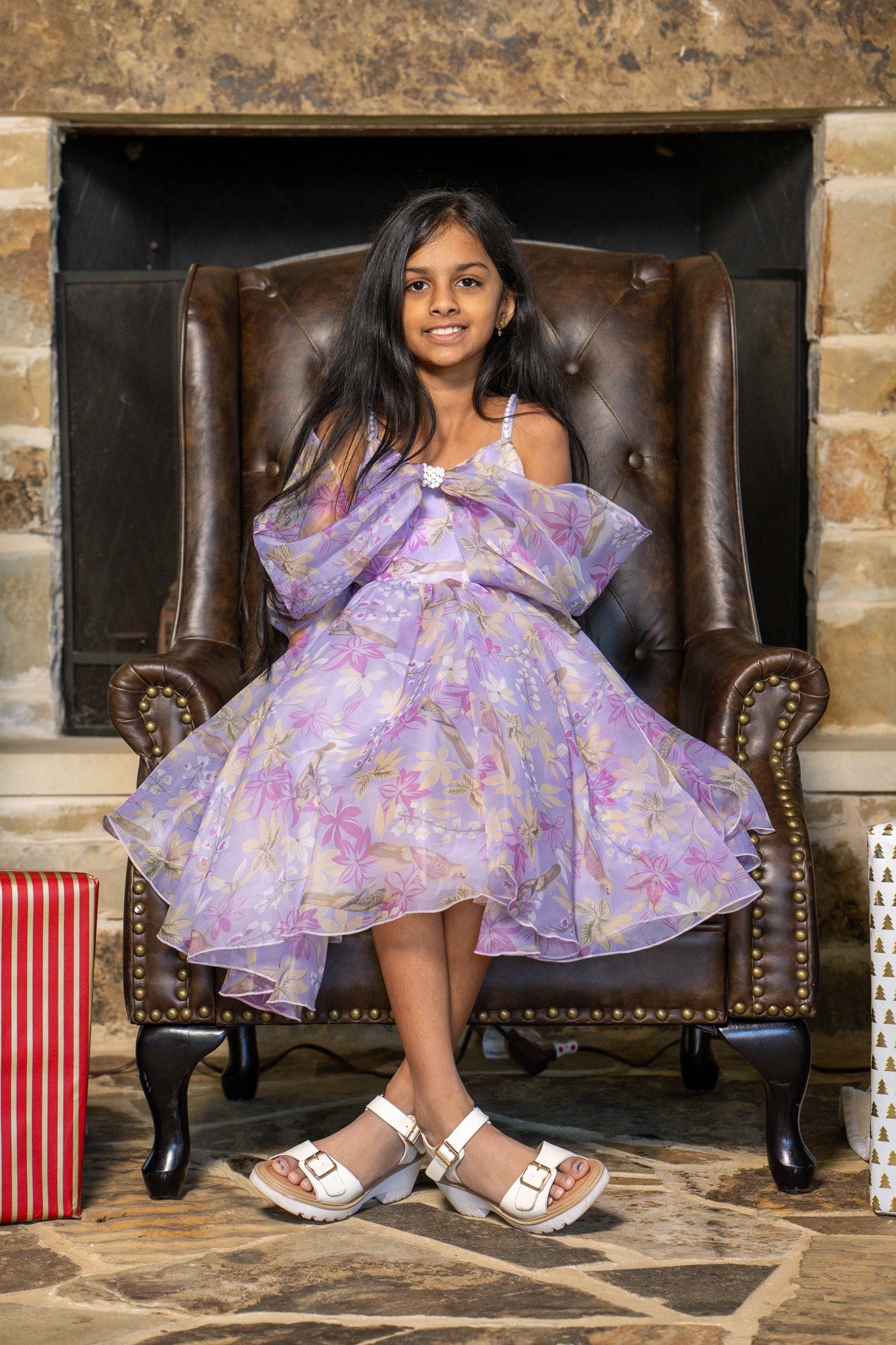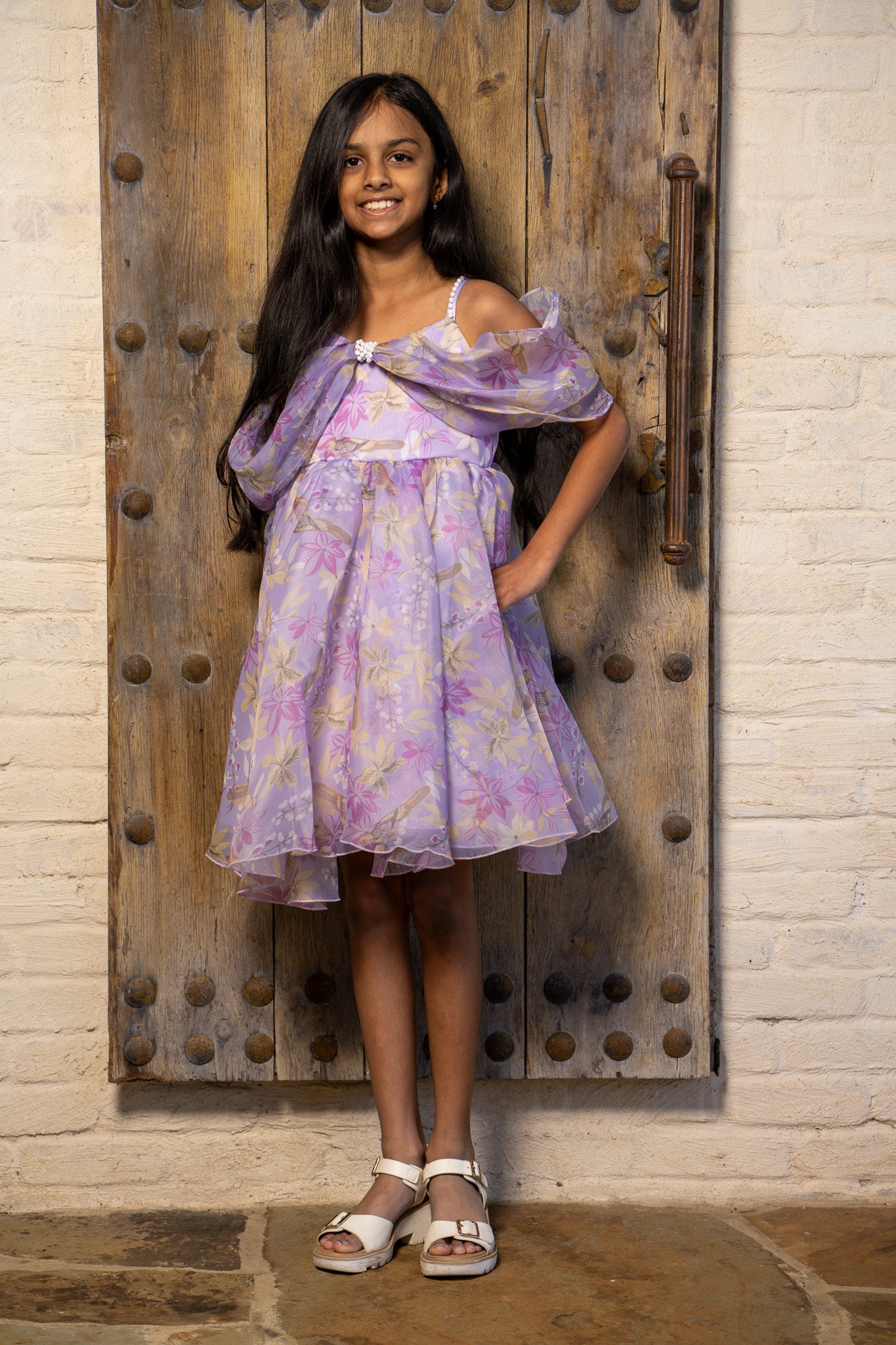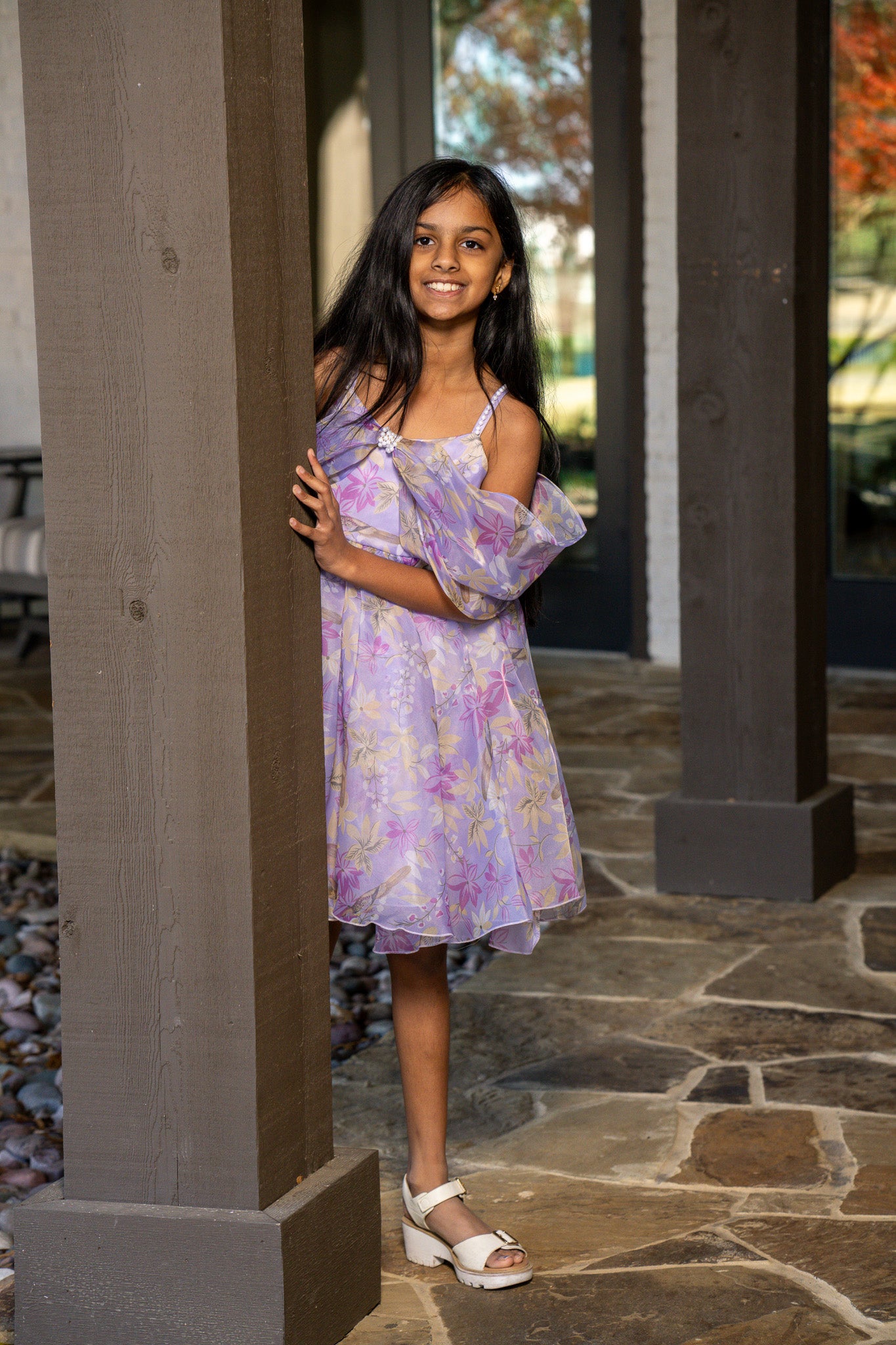 Let your little one drift into a world of charm and elegance with the Lilac Dreams Floral Dress. Featuring delicate pearl strap shoulders and a stunning lavender floral design, this dress exudes timeless beauty. The integrated sheer shoulder wrap adds a flowing, fairy-tale touch, making it the perfect choice for special occasions.