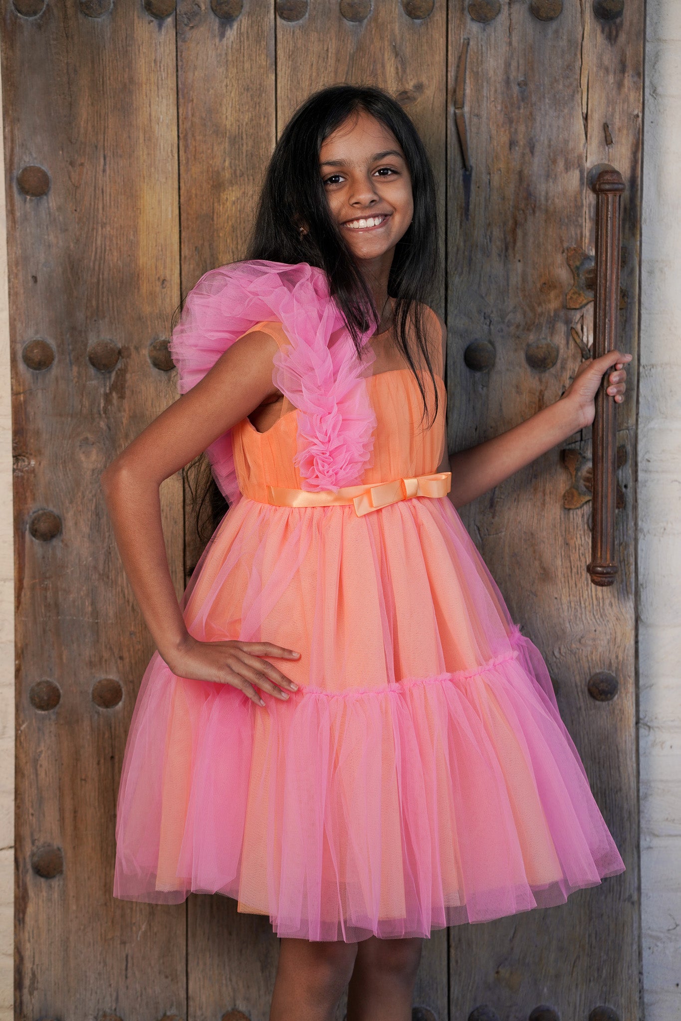 Add a pop of vibrant elegance to any celebration with the Orange Glow Tulle Party Dress! This eye-catching dress features bold orange tulle layers accented with soft pink hues for a striking combination. The asymmetrical ruffle shoulder brings a playful yet sophisticated flair, while the satin bow belt adds a charming finishing touch. Perfect for birthdays, weddings, or any special occasion where your little one wants to shine!