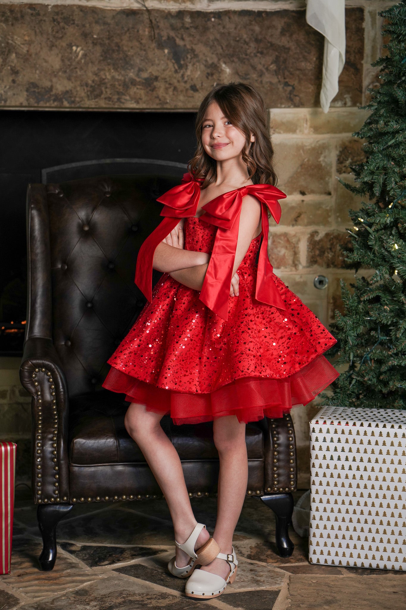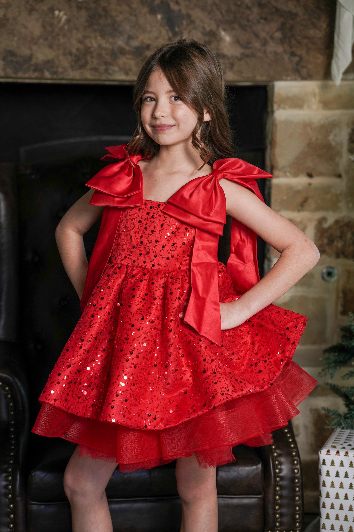 Make every occasion sparkle with the Ruby Radiance Sequin Bow Dress! This vibrant red dress features a dazzling sequin-embellished bodice and a playful layered tulle skirt for added volume. Oversized satin bows on the shoulders create a striking and sophisticated look, perfect for the holiday season, birthdays, or special celebrations.